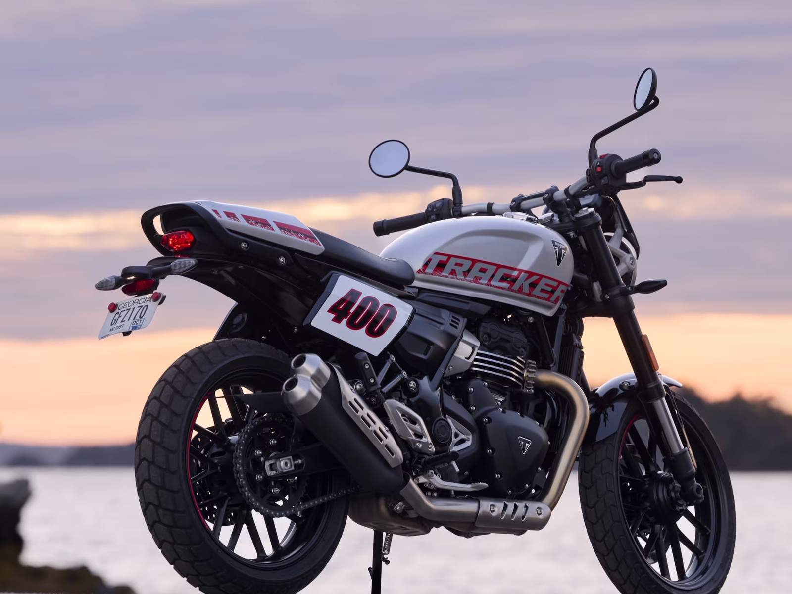 Upright and elbows-out—the Tracker 400 offers a dominant riding position and distinctive flat-track riding style.