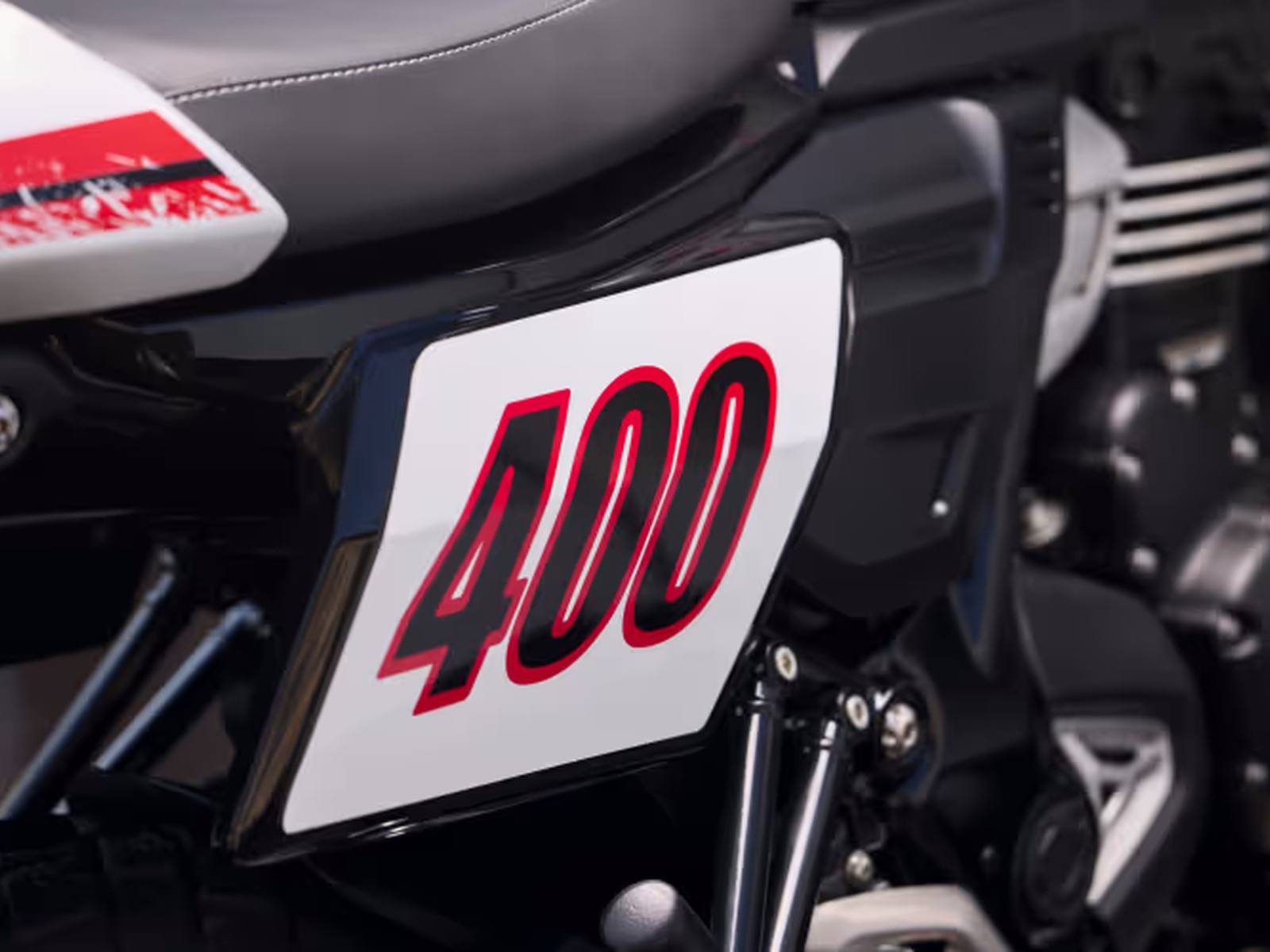 Inspired by flat-track racers of the past, the Tracker 400 features taut lines around the knee cut-outs on the fuel tank. A sporty flyscreen, seat cowl and number board proudly display the 400 race graphic.