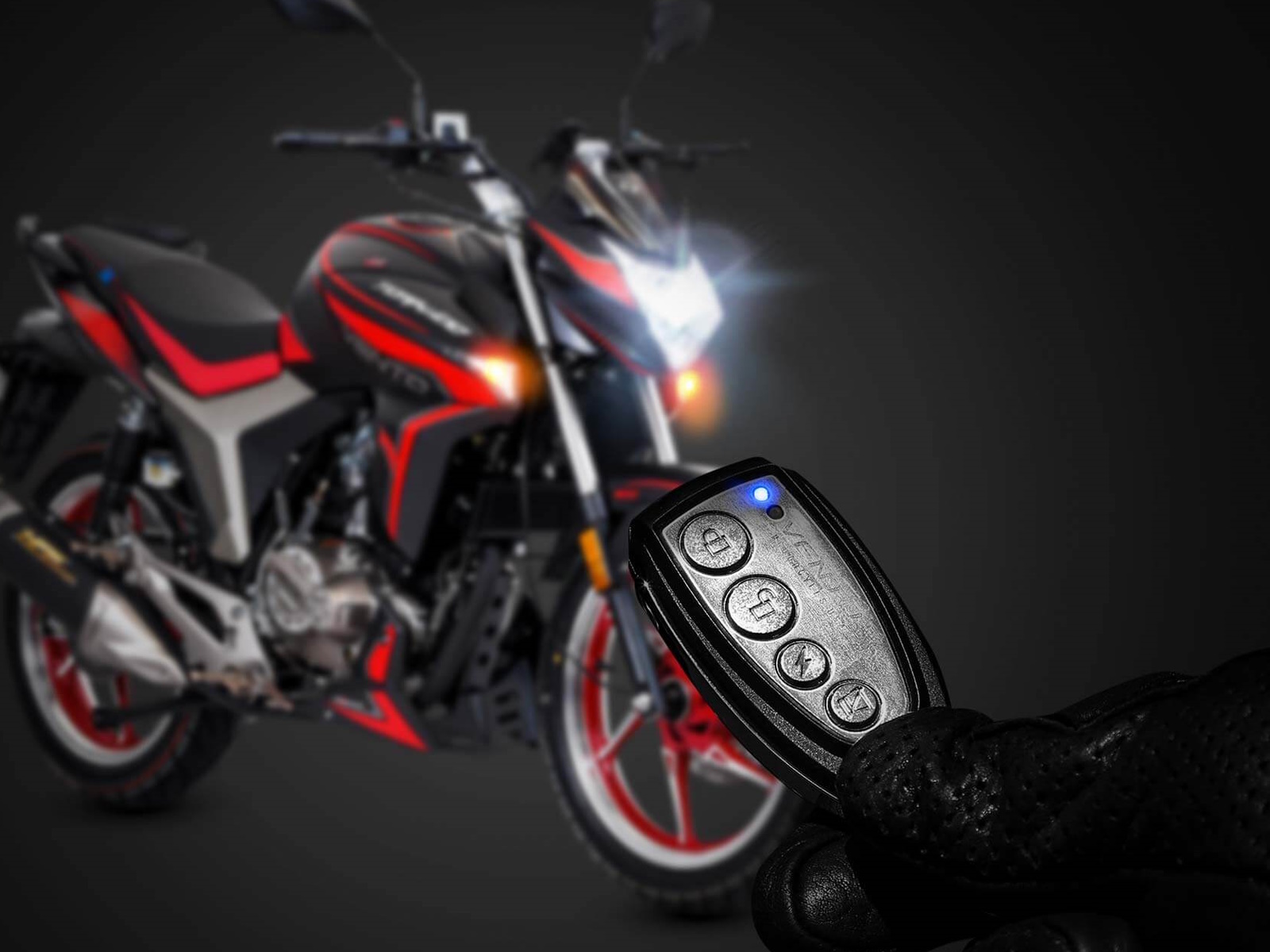 With remote control on and off, motion sensors and panic button.
